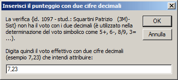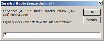 Viene richiesto il voto. Inseriamo quindi la nostra valutazione (con due decimali se abbiamo abilitato l'opzione "voti non interi" ovvero 7+, 8=, ... )