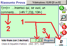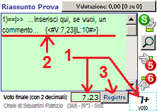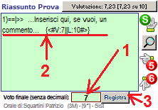 Dopo la conferma controllare la correttezza della valutazione (1). E' possibile (ma non obbligatorio!) inserire un commento relativo alla verifica (2): basta far un doppio click all'interno della frase "...Inserisci qui,...". Se il voto è assegnato è corretto possiamo confermarlo cliccando sul pulsante "Registra" (3).