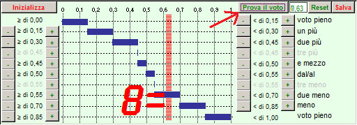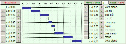 Il pannello consente di definire dei sotto intervalli all'interno di [0,1] che poi associo ai simboli +, ‡, ‡+, ½, -, =, ≡ ... . Ad esempio con le impostazioni visibili in figura il voto 7,63 diventa 8=. Gli intervalli possono essere modificati agendo sui pulsanti + e -. Utilizzando il tasto "prova il voto" è possibile verificare la correttezza delle nostre impostazioni.
