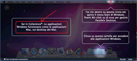Il grosso vantaggio di Parallels Desktop è che le applicazioni Windows (e quindi anche il Registro del Professore!) possono funzionare come delle vere e proprie applicazioni Mac (occorre attivare la modalità "Coherence" - vedi figura sottostante)