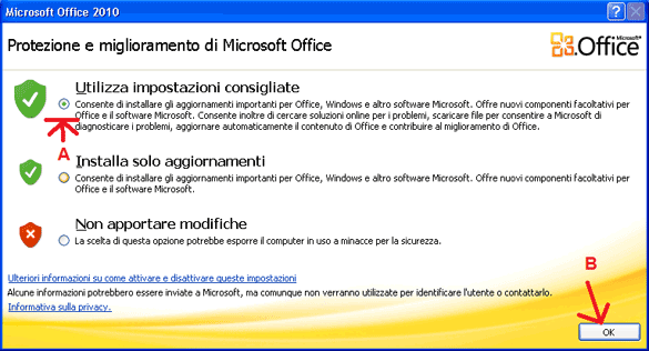 | 9) Impostiamo i livelli di protezione consigliati e poi clicchiamo su "OK" |